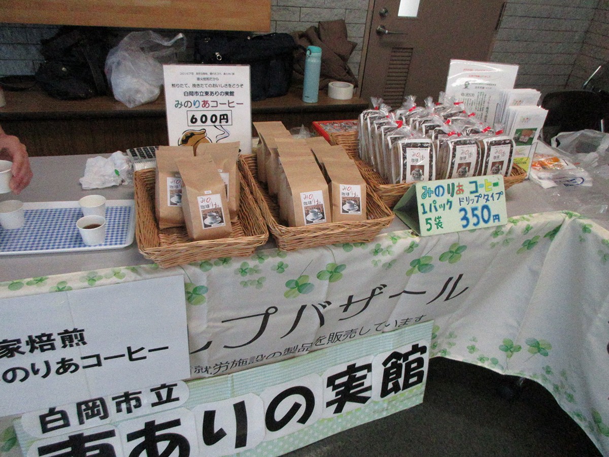 東ありの実館は、自家焙煎みのりあコーヒーをドリップタイプ、豆タイプ、粉タイプの3種類販売しました。深谷たんぽぽは、焼菓子やタンポポコーヒーなどの自事業所商品の他にも、同じ法人内の他事業所のパンと近隣の事業所のプリンも販売してくださいました。