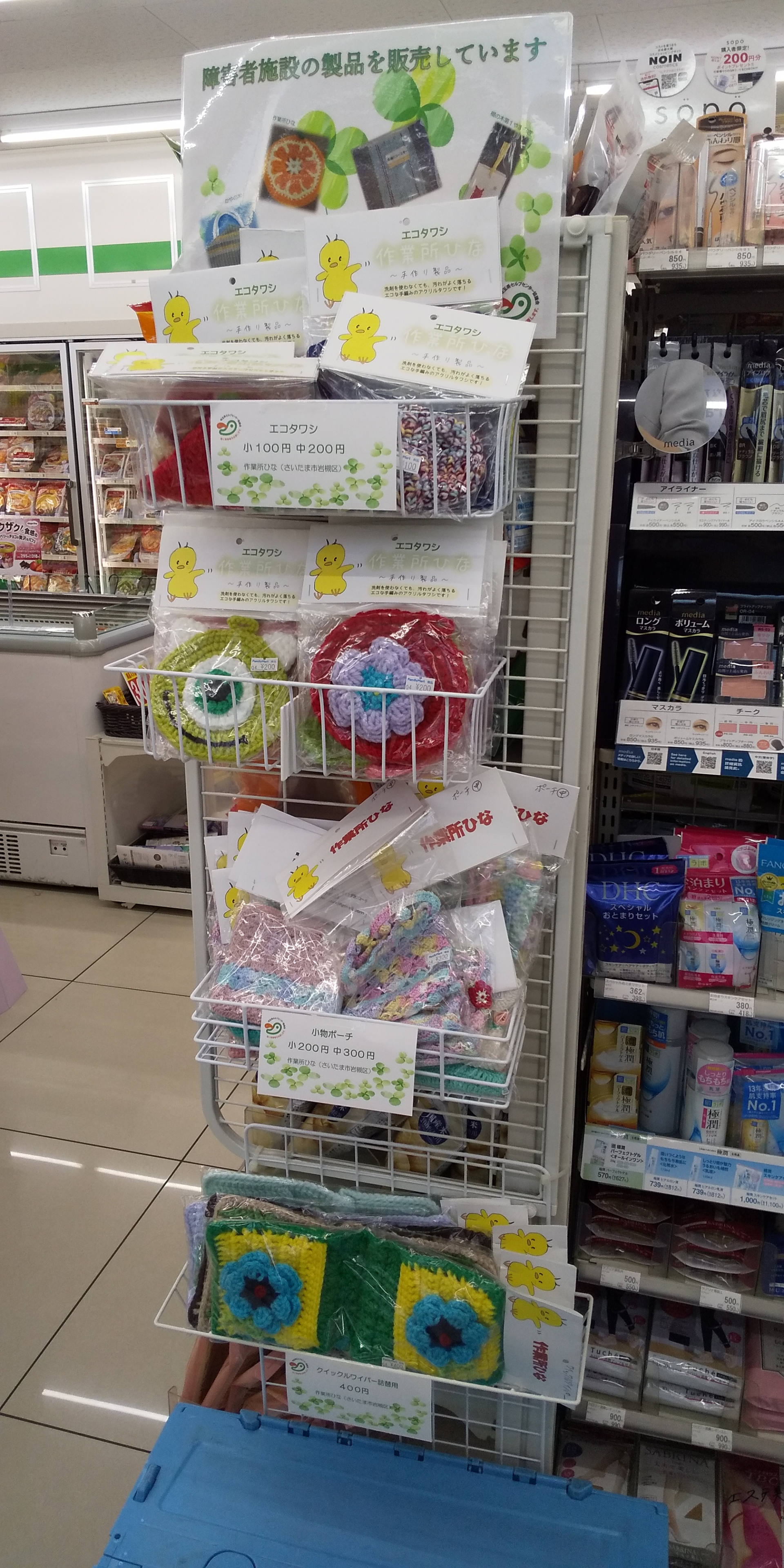 2021年10月からさいたま市内の6事業所のさをり織り、タワシや石鹸、紙すき製品、エコバックなど日用雑貨商品16種類を販売していただいています。