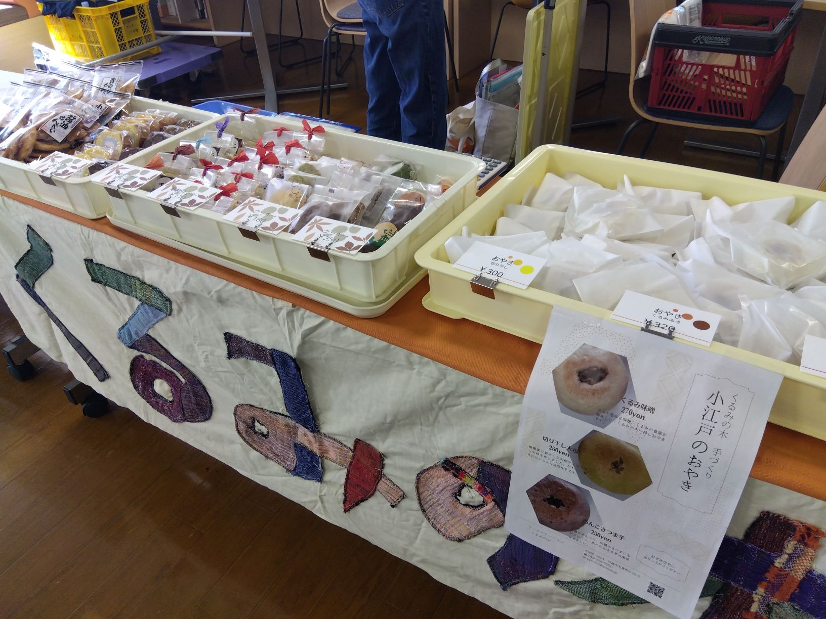 11月16日には、あかりワークス姫宮(宮代町)、久喜けいわ(久喜市)、ワークステーションくるみの木(川越市)の3事業所が参加しました。ワークステーションくるみの木の焼菓子とおやきは完売し、あかりワークス姫宮のお煎餅と久喜けいわのお味噌もたくさんお買い上げいただきました。