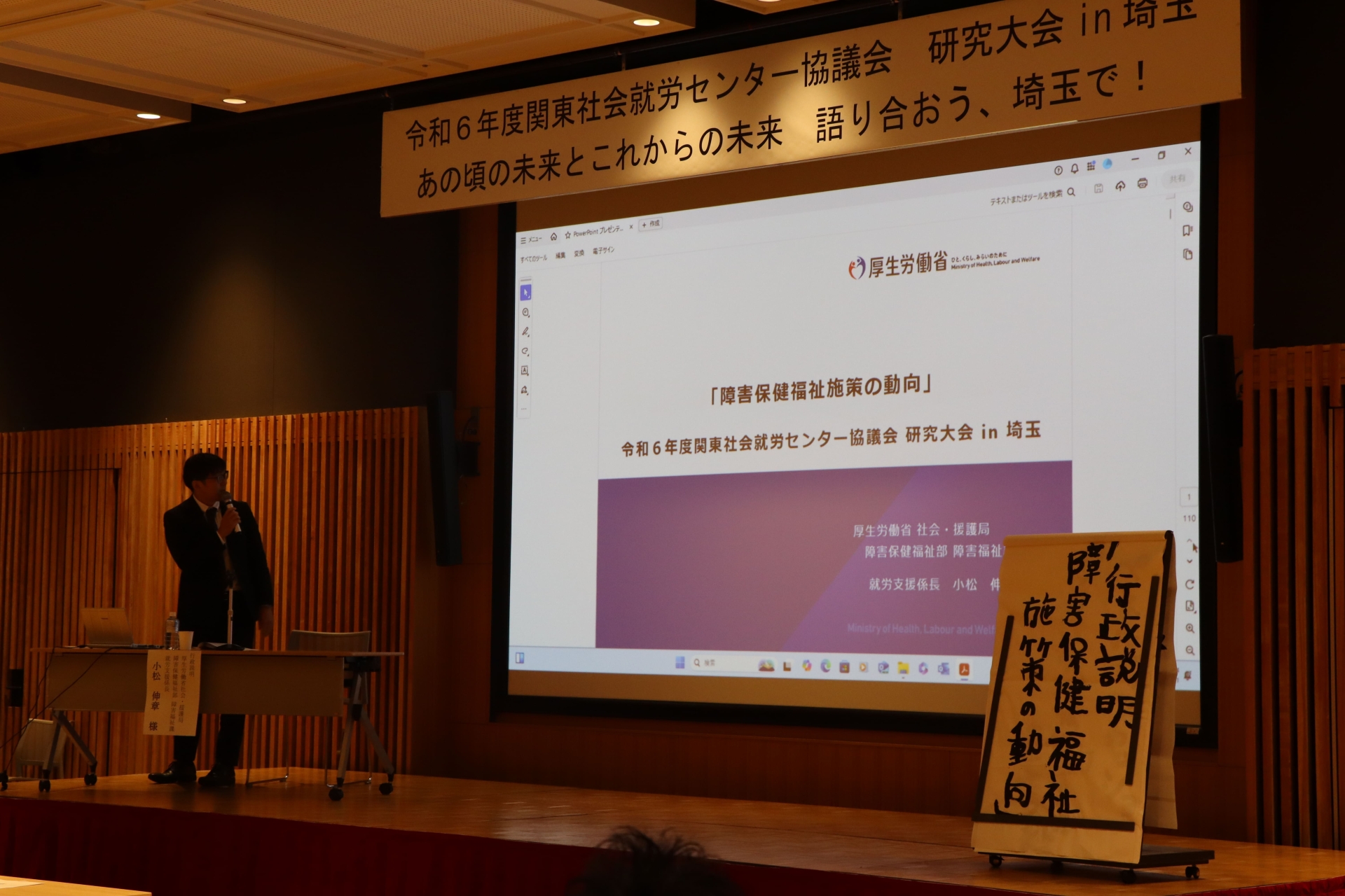 はじめに全国社会就労センター協議会会長叶義文氏による基調講演があり、令和7年10月施行の就労選択支援事業や多様な事業所の参入、また障害者権利条約の総括所見等について説明されました。次に厚生労働省社会・援護局障害保健福祉部障害福祉課就労支援係長小松伸章様による「障害保健福祉施策の動向」についての行政説明がありました。
