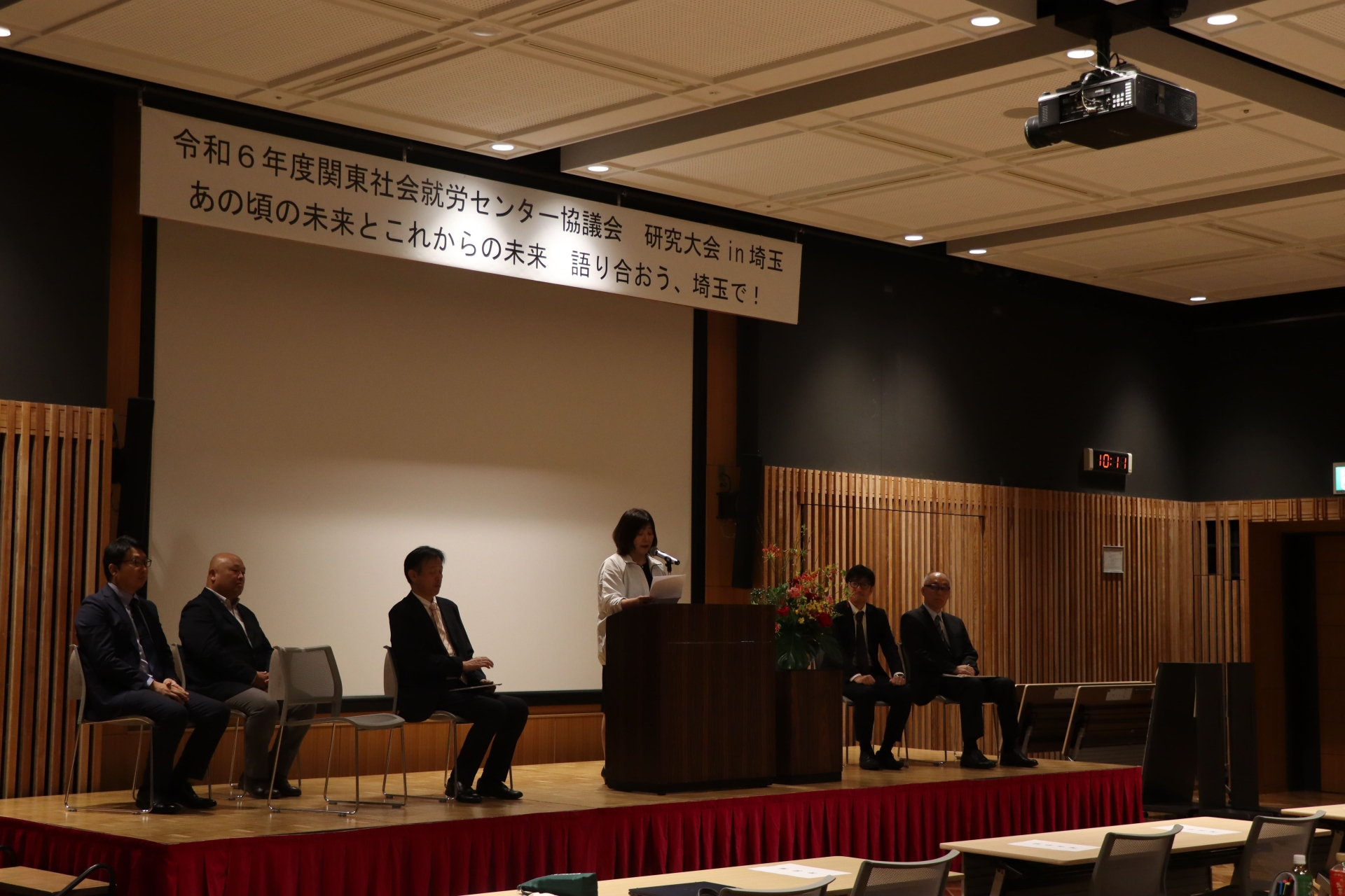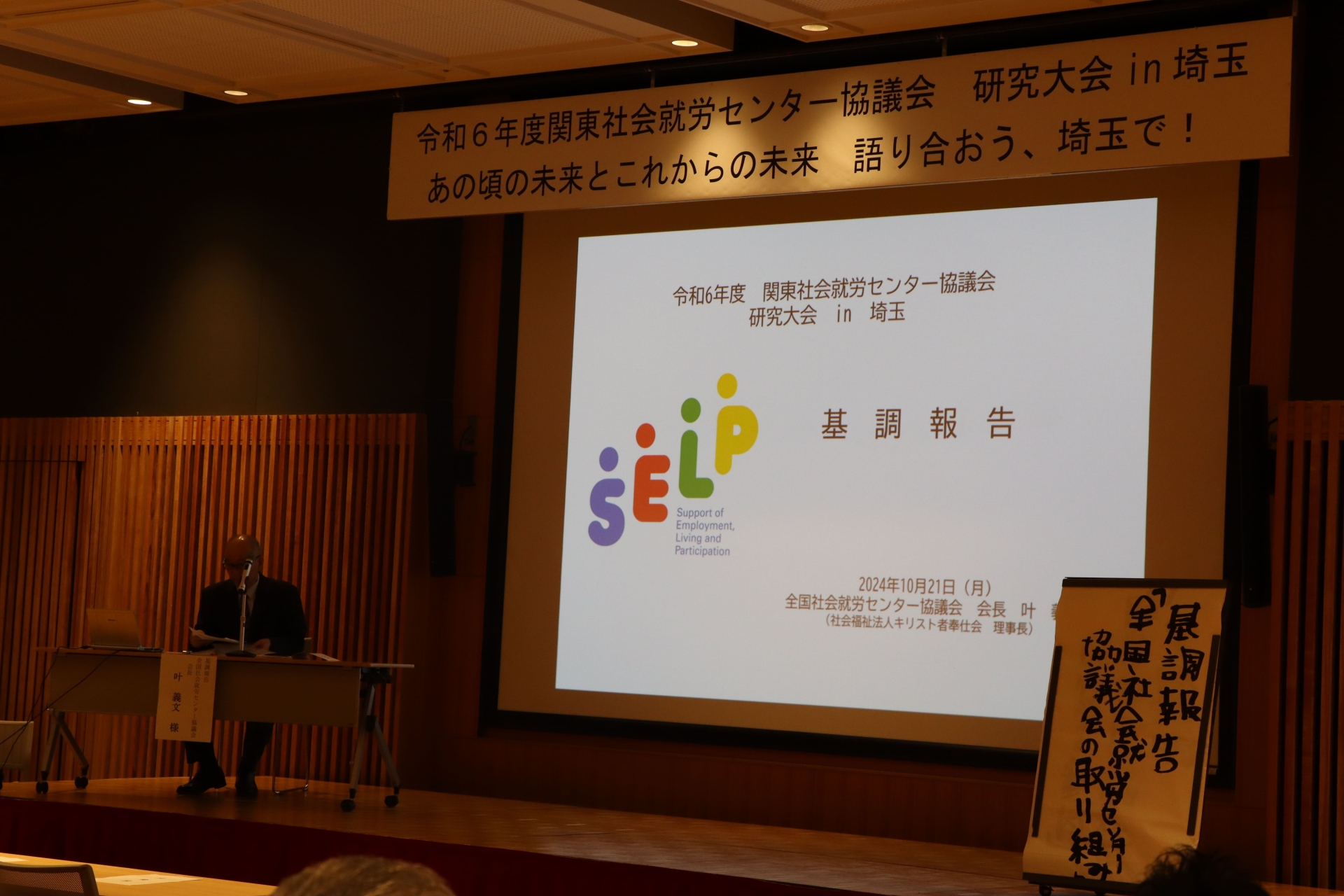 10月21日(月)にウエスタ川越で関東社会就労センター協議会研究大会in埼玉「あの頃の未来とこれからの未来 語り合おう、埼玉で!」を開催しました。関東ブロック11都県から124名の参加がありました。大会の司会は、埼玉セルプ協会員事業所の利用者2名が担い、サポート司会と一緒に進行しました。