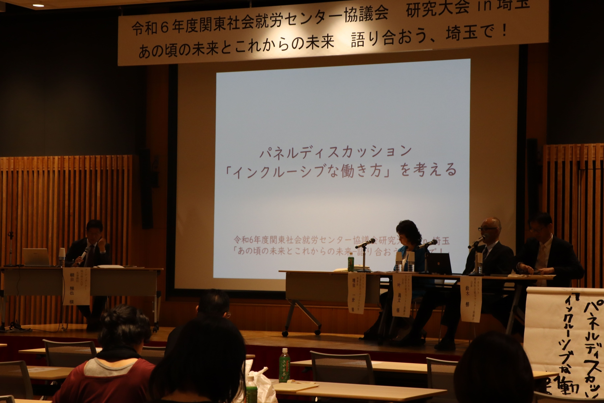 午後は、埼玉県立大学名誉教授朝日雅也氏をコーディネーターにお招きし、パネルディスカッション「『インクルーシブな働き方』を考える」と実践報告「就労支援における『公助』を改めて問う」の2本立てで行いました。前半のパネリストは、叶会長、関東社会就労センター協議会会長鈴木暢氏、公益社団法人やどかりの里理事長増田一世氏でした。取り巻く社会情勢が変わる中で「インクルーシブな働き方」をどのような形で実現するのか3人のお話を伺いながらその道筋を一緒に考える時間になりました。パネラーの事業所は、地域に積極的に出向き、顔の見える関係づくりをし、「地域の中で事業所があって良かった、助かったね」と言ってもらえるようになりました。作業所が地域に必要な部分を担っていることや障害のある人一人ひとりの働くことにそれぞれの人生が地域で位置づいていることが伝わりました。国連の日本政府への勧告、障害者がシェルタードワークショップに分離されるべきではないという意見とは一致しませんが、実際に私たちが地域の中で実践し築いてきた福祉的就労の価値を今一度見出し、吟味し、共有すること、そして社会に対しても説明していくことが、今後のより開かれたインクルーシブな働き方(労働市場)へいたる道筋のひとつになるのではと感じました。