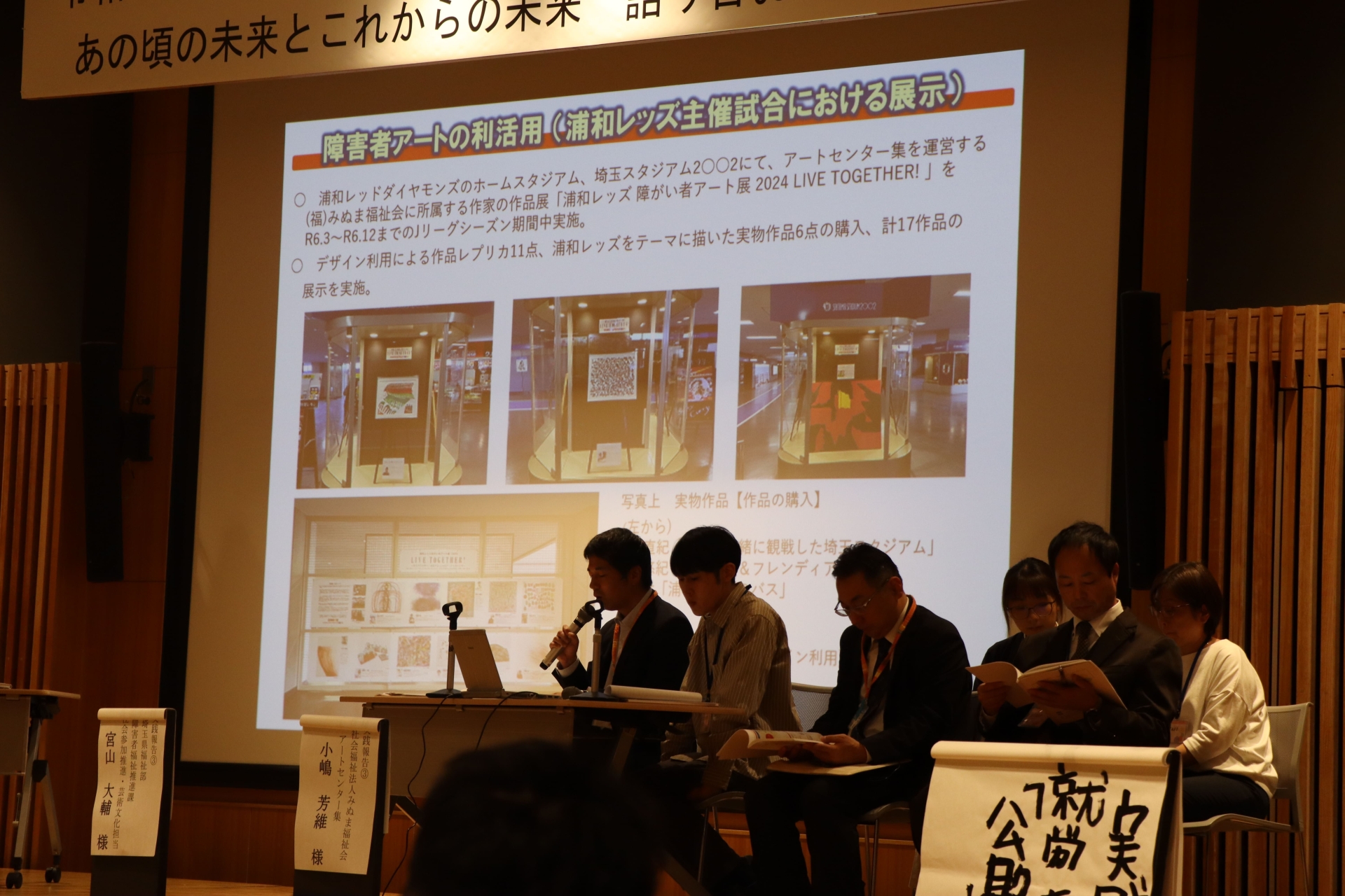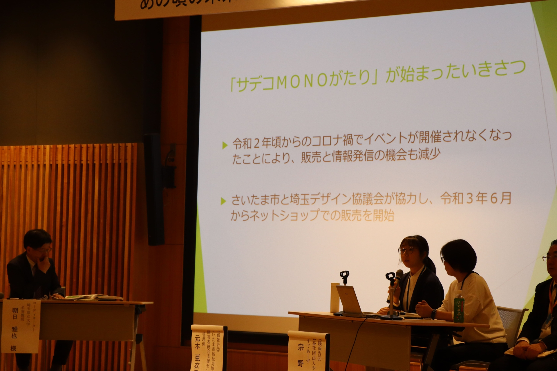 次に、行政と事業所職員のペア3組から実践報告がありました。?「埼玉県×優先調達」?「さいたま市×サデコMONOがたり」?「埼玉県×埼玉県障害者芸術文化活動支援センターアートセンター集」の実践では、まさに「公助」との協働で、熱意あふれるいきいきとした報告でした。朝日氏は「それぞれの強みを活かし合い、立場を越えて、融合、相互理解、対等性、先進性がみられる」とまとめ、協働することの意味や価値を再認識でき、バリエーション豊かな「働く」のヒントが随所にみられる報告となりました。