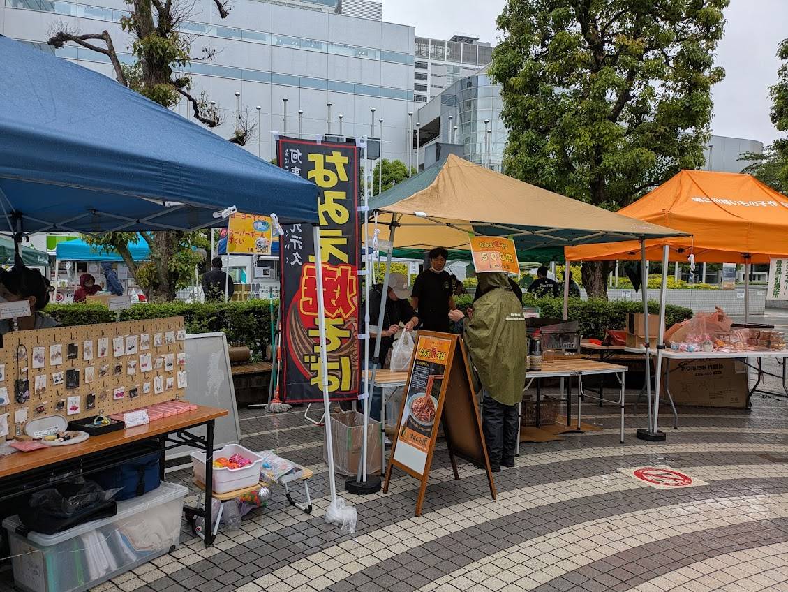 会場内には、28事業所のテントやキッチンカーが並び、雨の中工夫をして商品を販売していました。模擬店では、複数事業所間でのコラボ商品もあり、埼玉セルプ協会員事業所の繋がりを感じることができました。スタンプラリーも例年通り行い、親子で楽しまれている方もいらっしゃいました。協賛金をいただいた埼玉ダイハツ販売株式会社様が福祉車両の展示をされ、事業所職員も興味関心を持って質問をしていました。