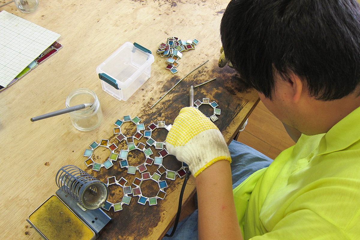当初は缶プレスやウエス(機械の油拭き用布)作りの仕事が主流でしたが、現在は絵画、織り、ステンドグラスなどの表現活動へと幅が広がっています。