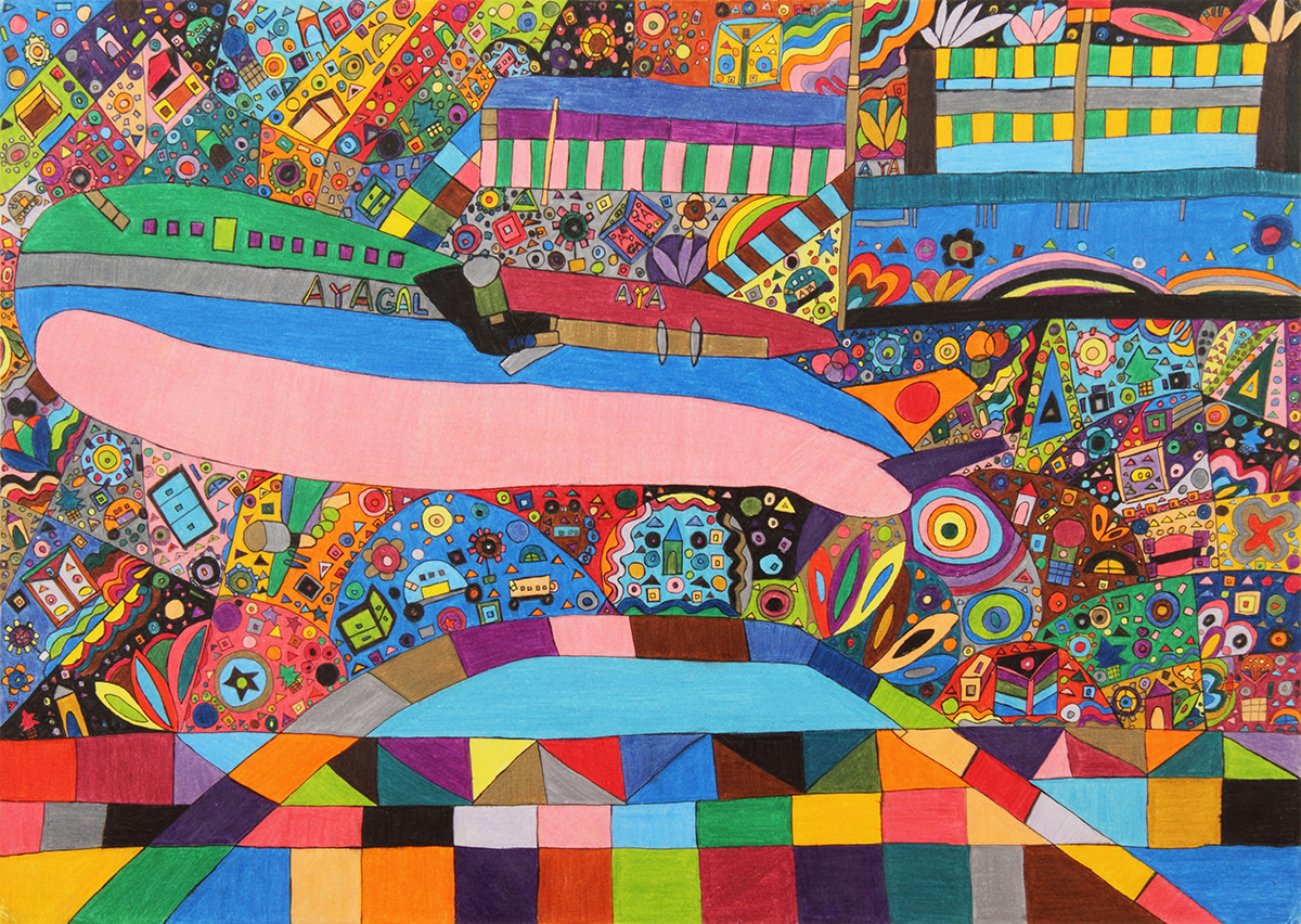 あやさんと言えば、「飛行機」。でも、自分の表現を見つけるまで、悩み、模索し続けてきた。養護学校の修学旅行で行った沖縄。「また飛行機に乗って、沖縄に行きたい」という思いから飛行機というモチーフを見つけた。