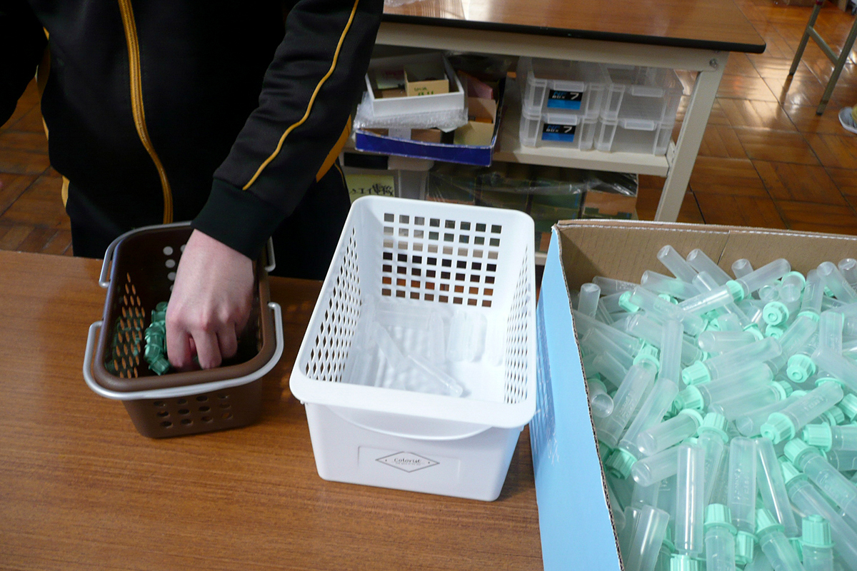 各企業からの下請受注作業です。巧緻性を必要とする衛生容器のバリ取り・組立などを行っています。