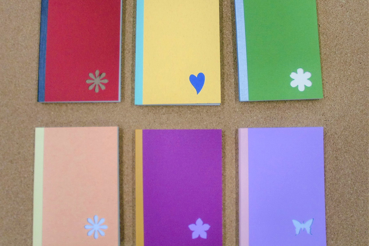 サイズは12.5?×9?の持ち運びしやすいサイズです。(中は白無地で約80P)様々な色、型抜きがあるので、自分で選べる楽しさも!!