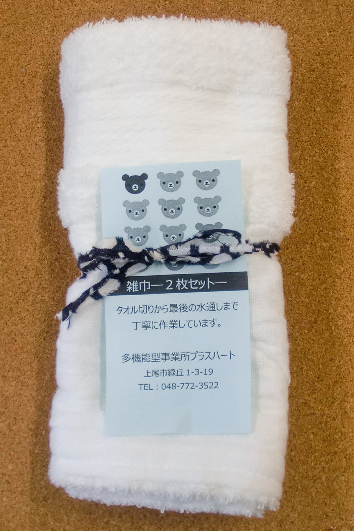タオルカットすることから始まり最後の水通しをして完成させています。2枚セットで100円、ひも付きで便利です。